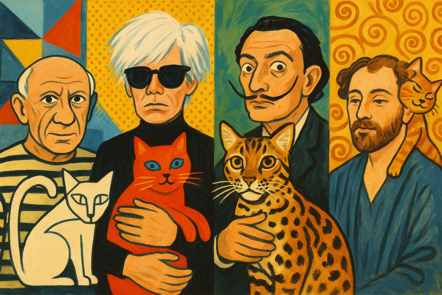Andy Warhol turned his 25 cats named Sam into pop icons, each a mashup of elegance and absurdity. Salvador Dalí staged mid-air cat photography (ethics questionable, visuals legendary). Georgia O’Keeffe let her cats roam her desert studio like furry art directors.