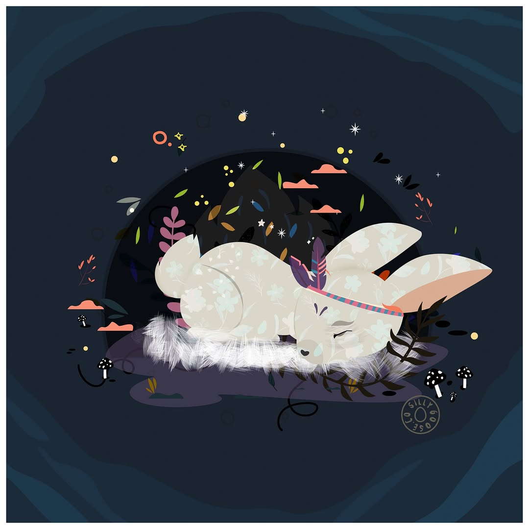 A rabbit draped in floral patterns dozes on a bed of feathers. Around it, the universe hums tiny leaves, drifting stars, and forgotten lullabies circle in the night. This is rebirth: the quiet turn of sleep into transformation, and waking with the scent of spring on your fur.